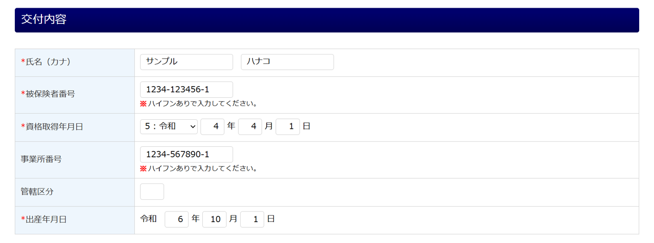 ※「氏名変更」欄を空欄にすると、PDF出力で「被保険者氏名」と「フリガナ」に名前が表示されません。