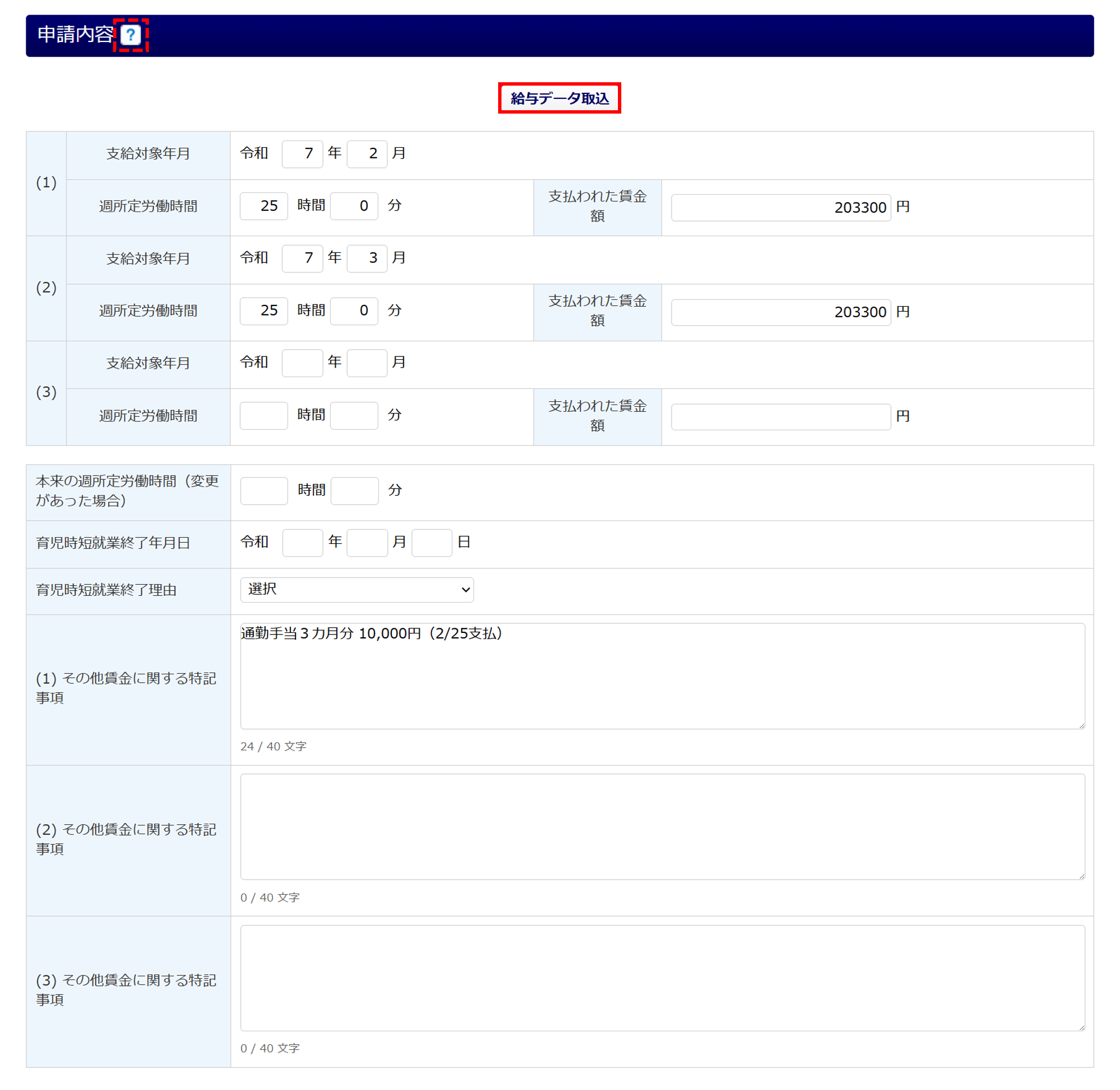 ※「申請内容」欄の「育児時短就業開始年月日」を入力している場合、自動