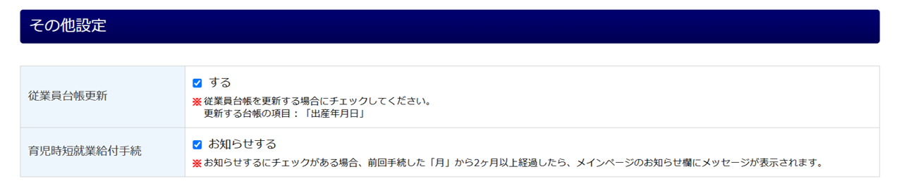 ※「お知らせする」のチェック有無を、従業員台帳の「育児時短就業給付手続」に更新します。