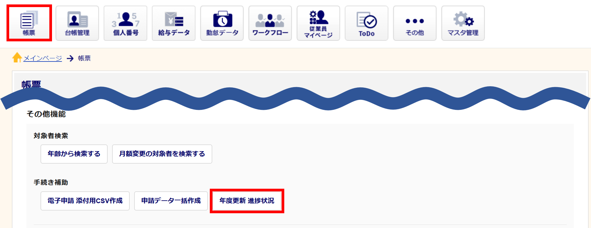 [帳票]>[年度更新 進捗状況]をクリックします。