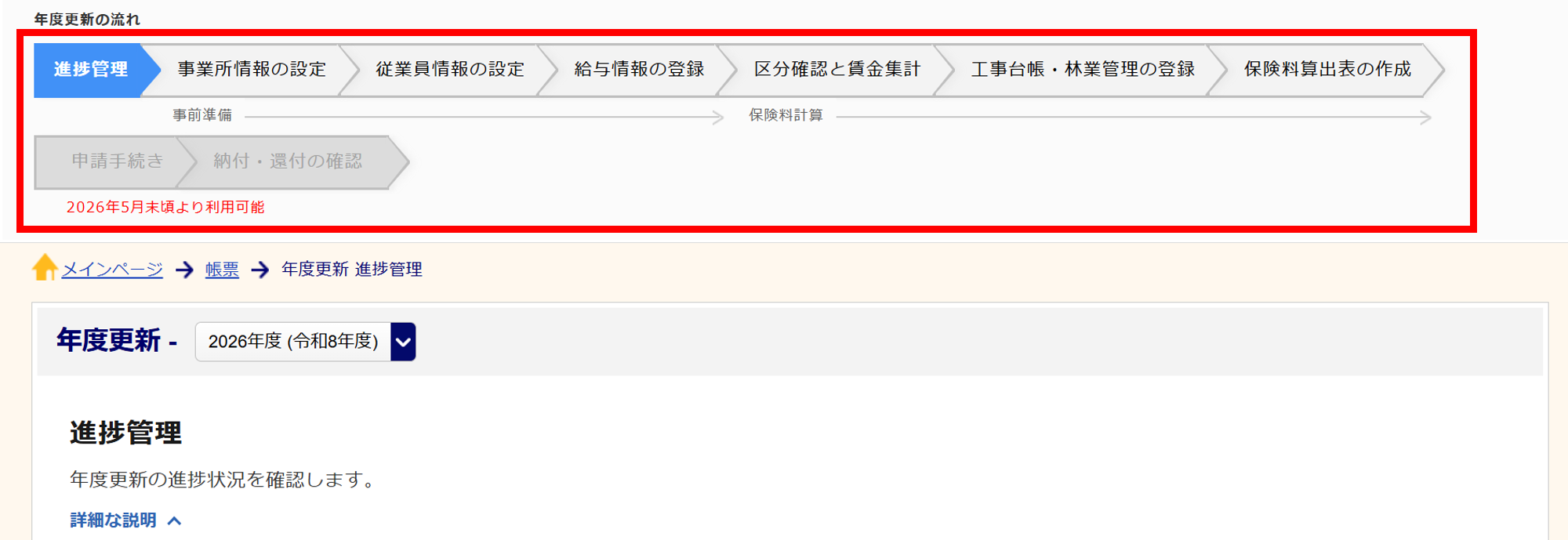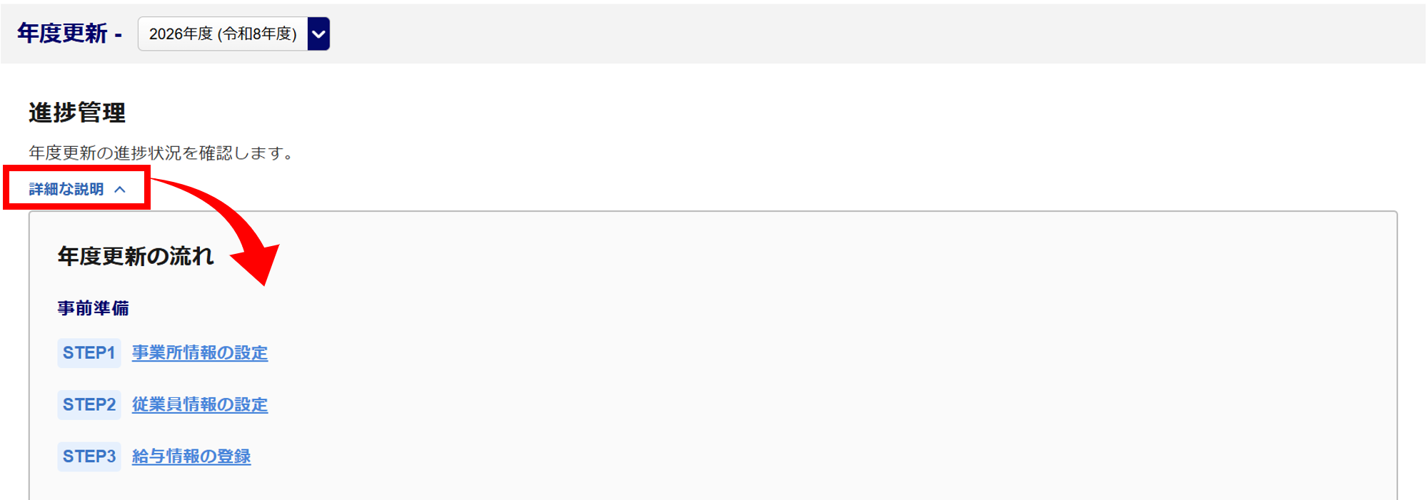 「詳細な説明」をクリックすることで、「年度更新の流れ」を確認することができます。