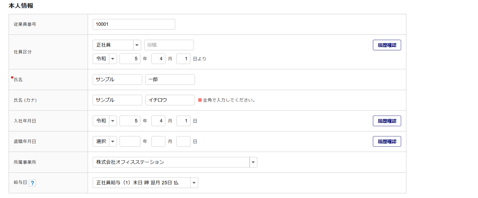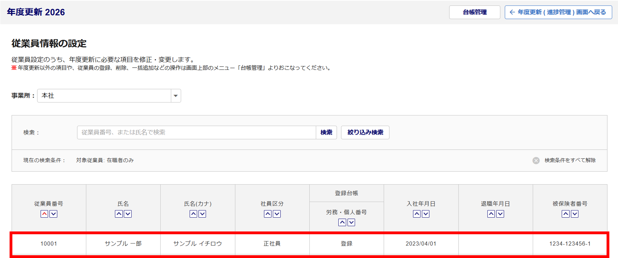 「従業員情報の設定」画面では、従業員台帳に登録している全従業員が表示されます。