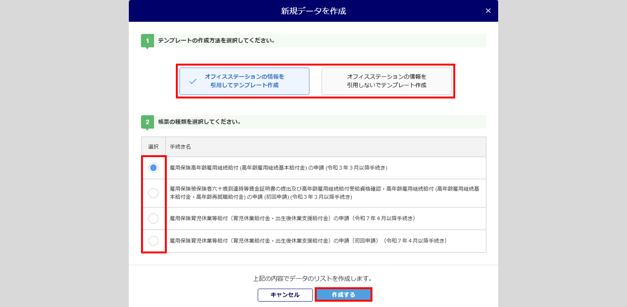 「テンプレートの作成方法」に「オフィスステーションの情報を引用してテンプレート作成」を選択します。