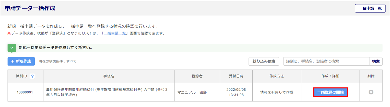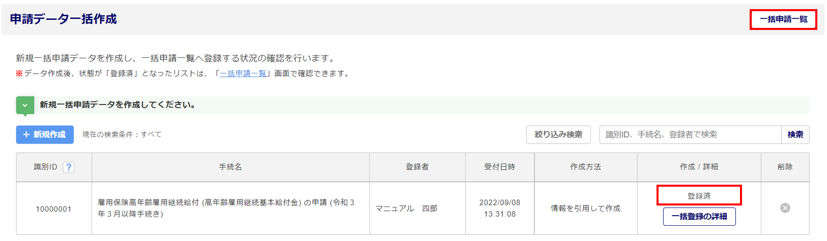 登録後、[一括申請一覧]をクリックすると、「一括申請一覧」画面が表示されます。