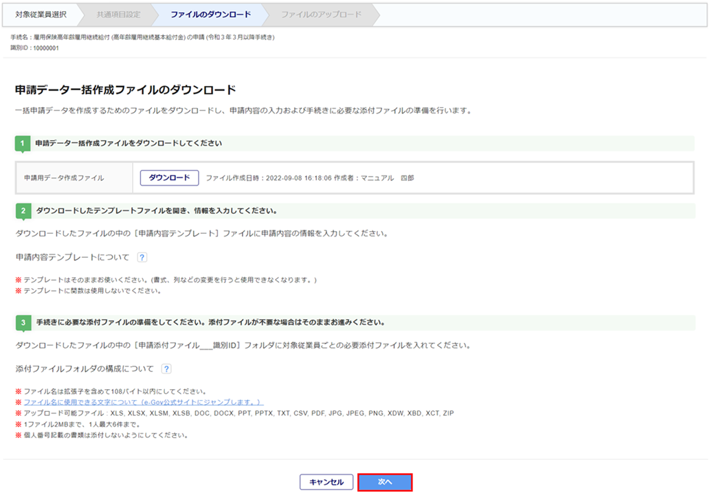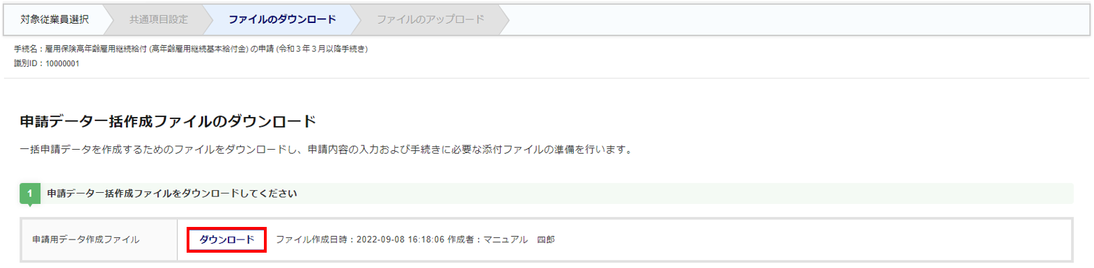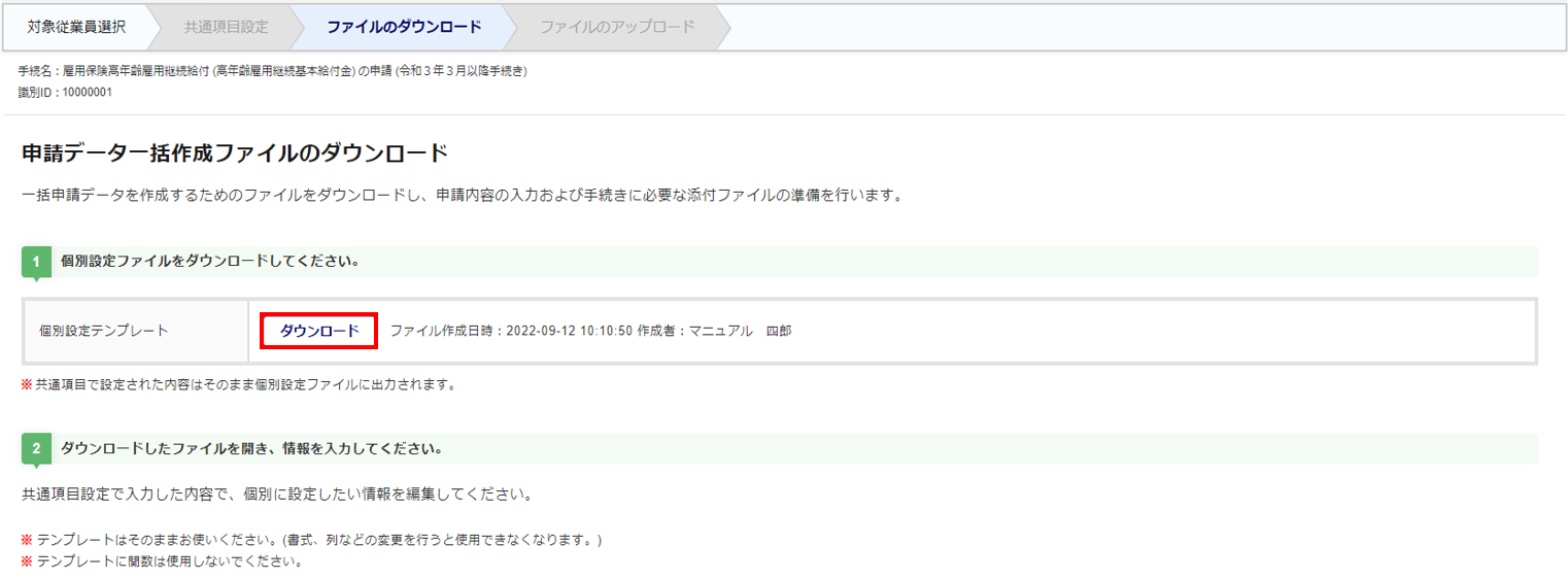 申請用データ作成ファイルの[ダウンロード]をクリックします。
