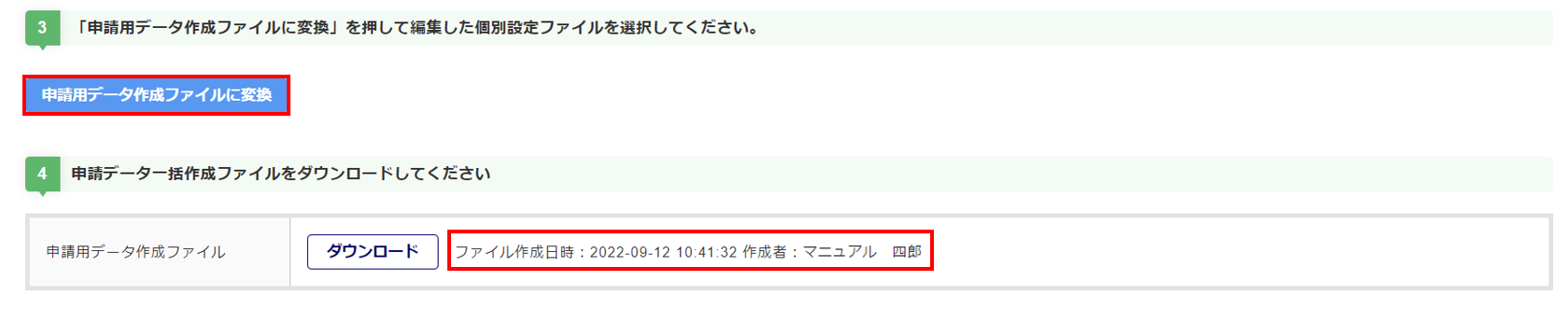 [申請用データ作成ファイルに変換]をクリックし、保存した個別設定ファイルを選択すると、申請用データ作成ファイルを作成します。「ファイル作成日時」を確認してください。