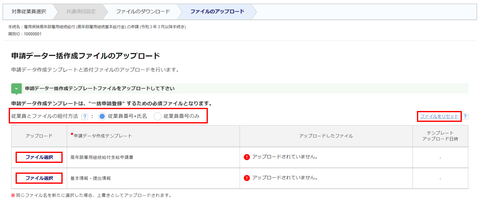 申請データ一括作成テンプレートのアップロード