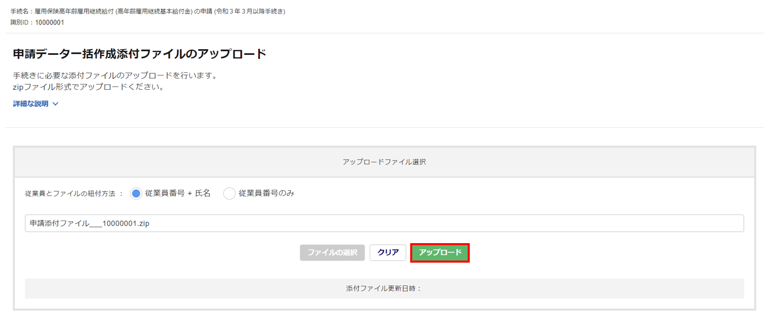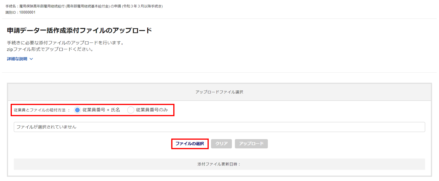 「申請データ一括作成添付ファイルのアップロード」画面が開くので、「従業員のファイルと紐付方法」を選択し、[ファイルの選択]をクリックし、圧縮した「申請添付ファイル___識別ID」(zipファイル)を選択します。