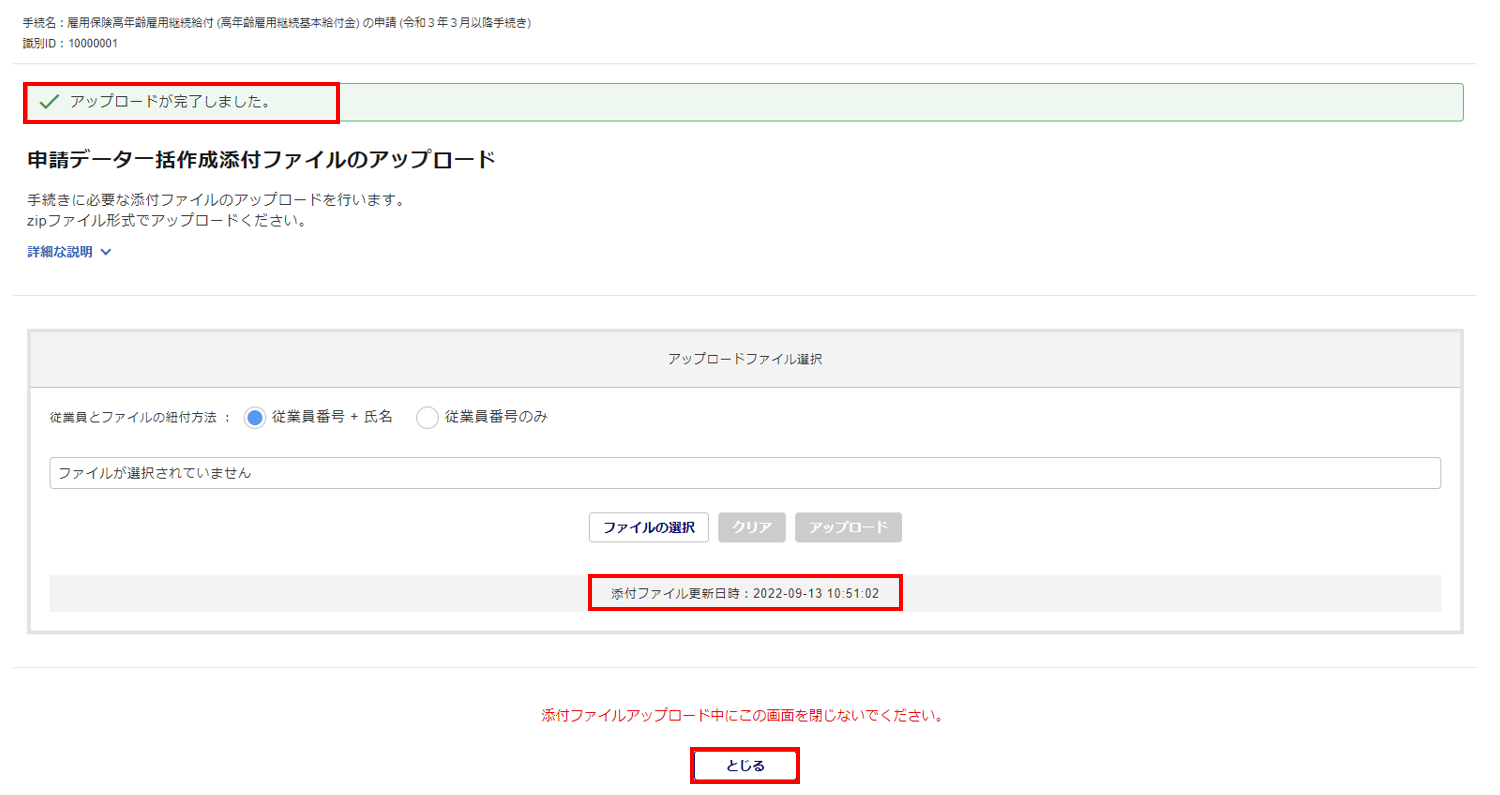 画面上部に「アップロードが完了しました。」と表示され、「添付ファイル更新日時」が更新されたら、アップロードは正常に終了です。