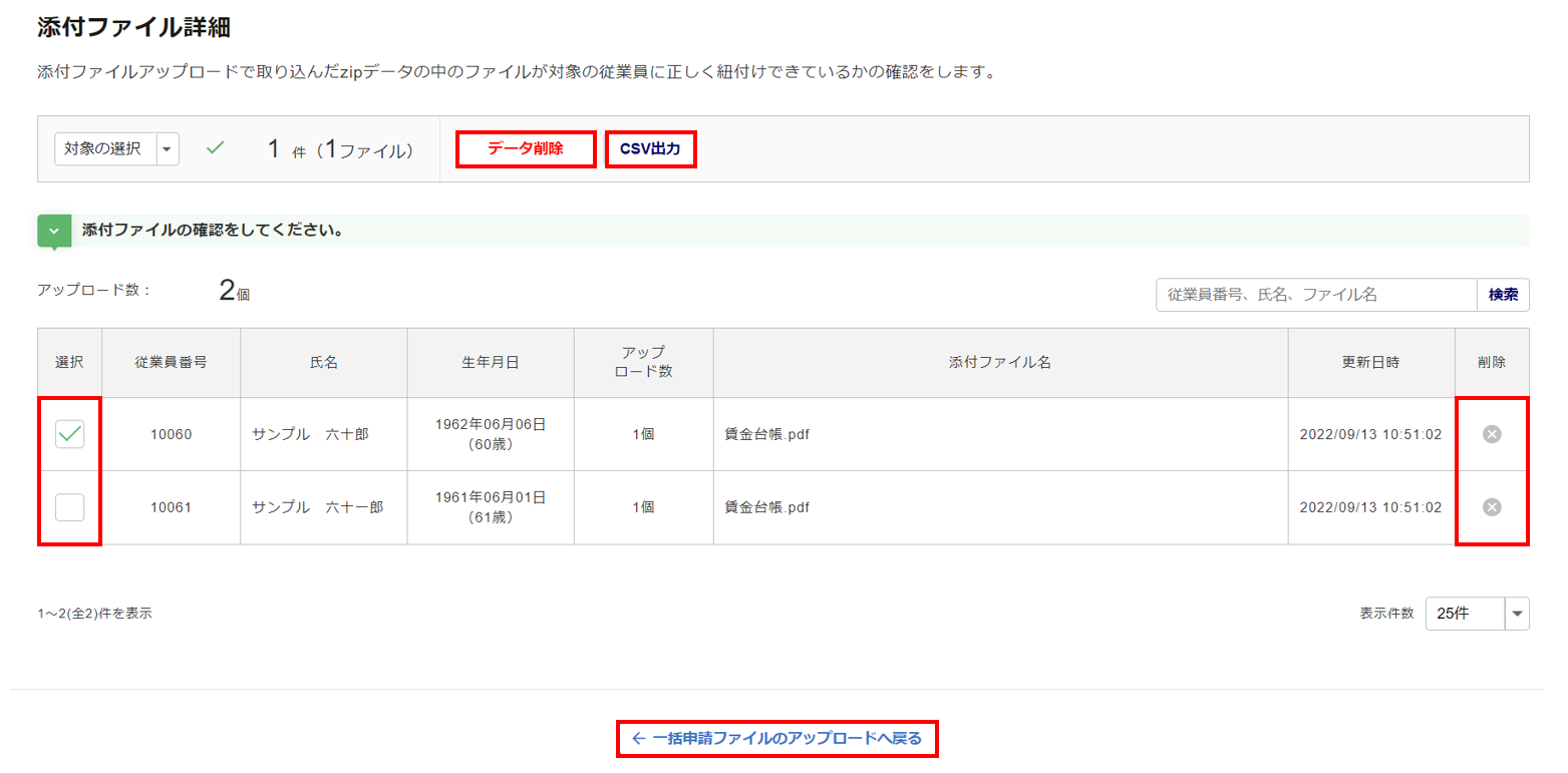 添付ファイルのアップロードで取り込んだzipファイルの中のファイルが従業員に正しく紐付けできているか確認します。確認後、問題がなければ[一括申請ファイルのアップロードへ戻る]をクリックします。