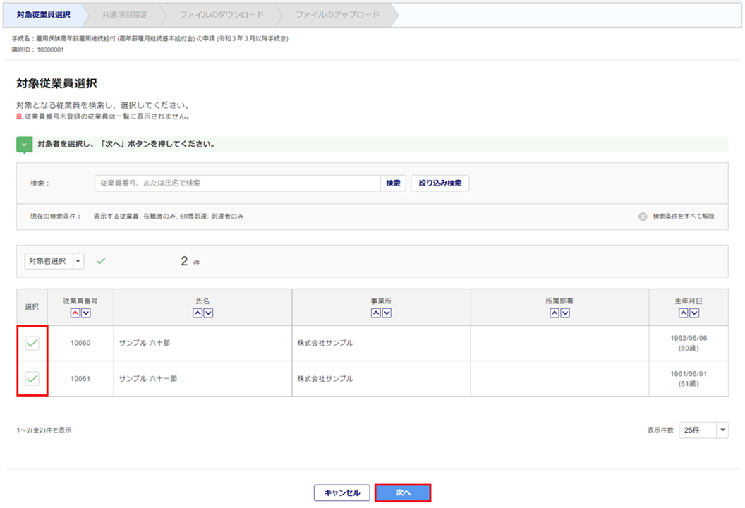 対象となる従業員を検索し、「選択」列にチェックをつけ、[次へ]をクリックします。