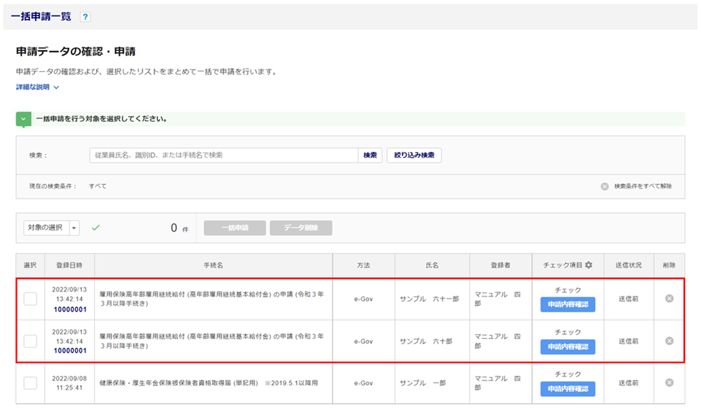 「一括申請一覧」画面に、一括申請登録したデータが表示されているか確認します。