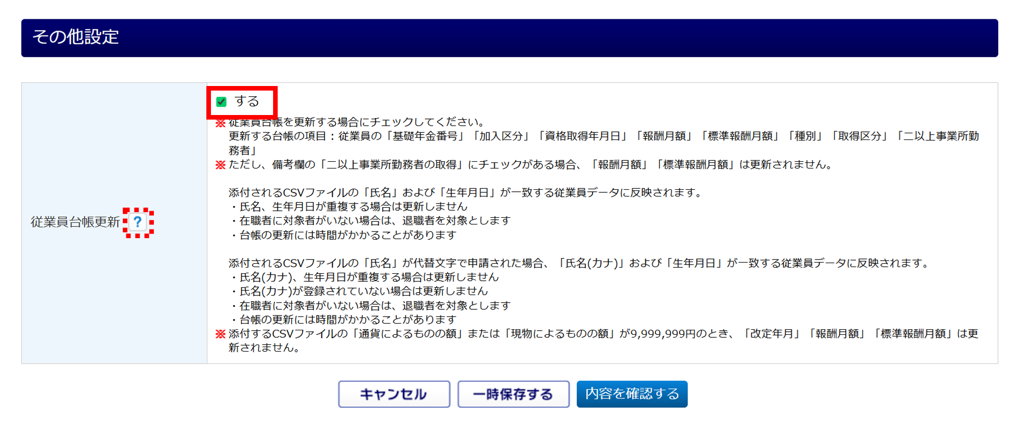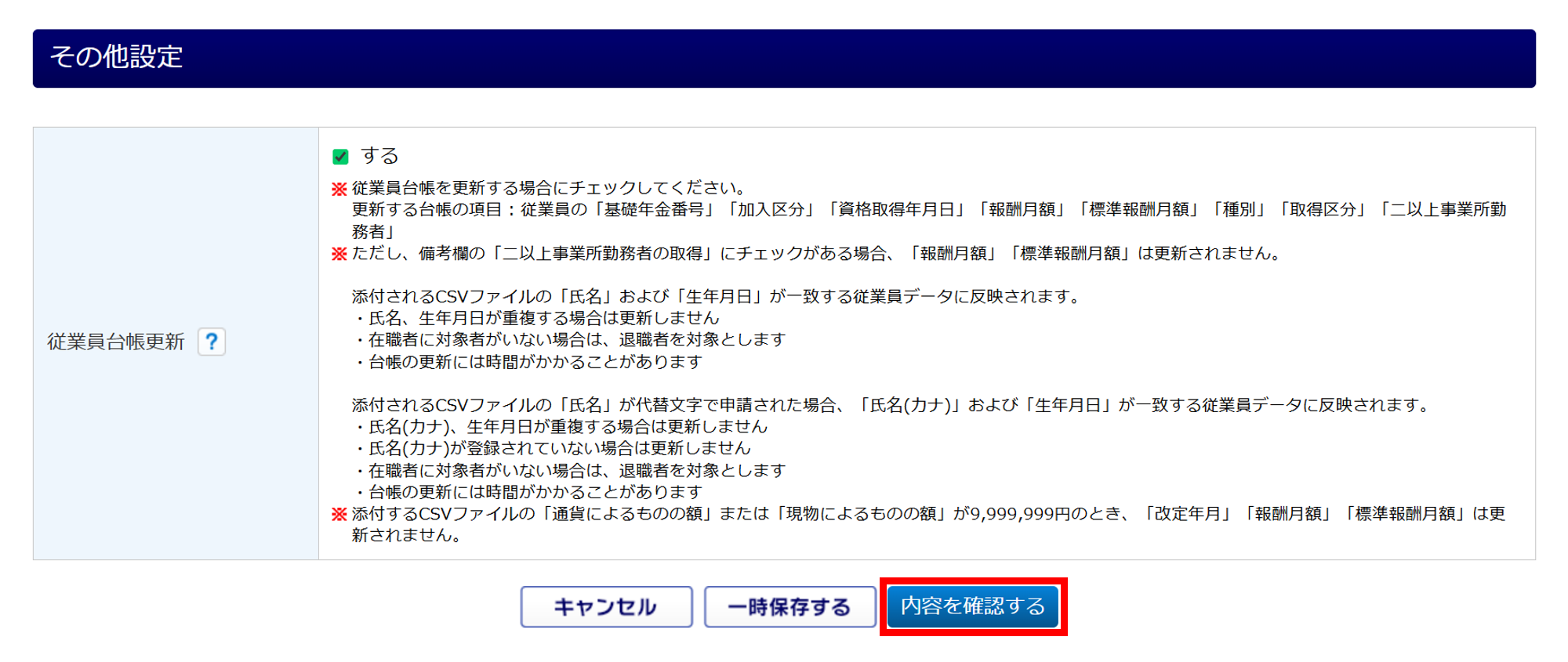「従業員台帳更新」の「する」にチェックすると、申請時に添付したCSVの情報を従業員台帳へ更新することができます。