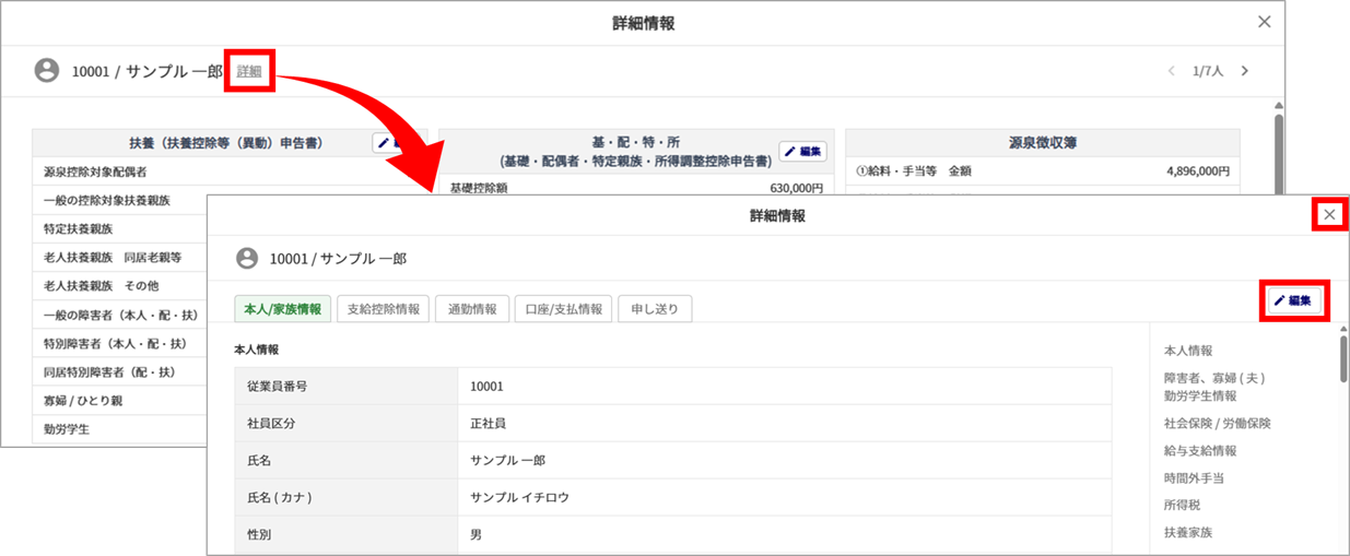 従業員氏名横の[詳細]をクリックすると、従業員データの「詳細情報」画面が開きます。