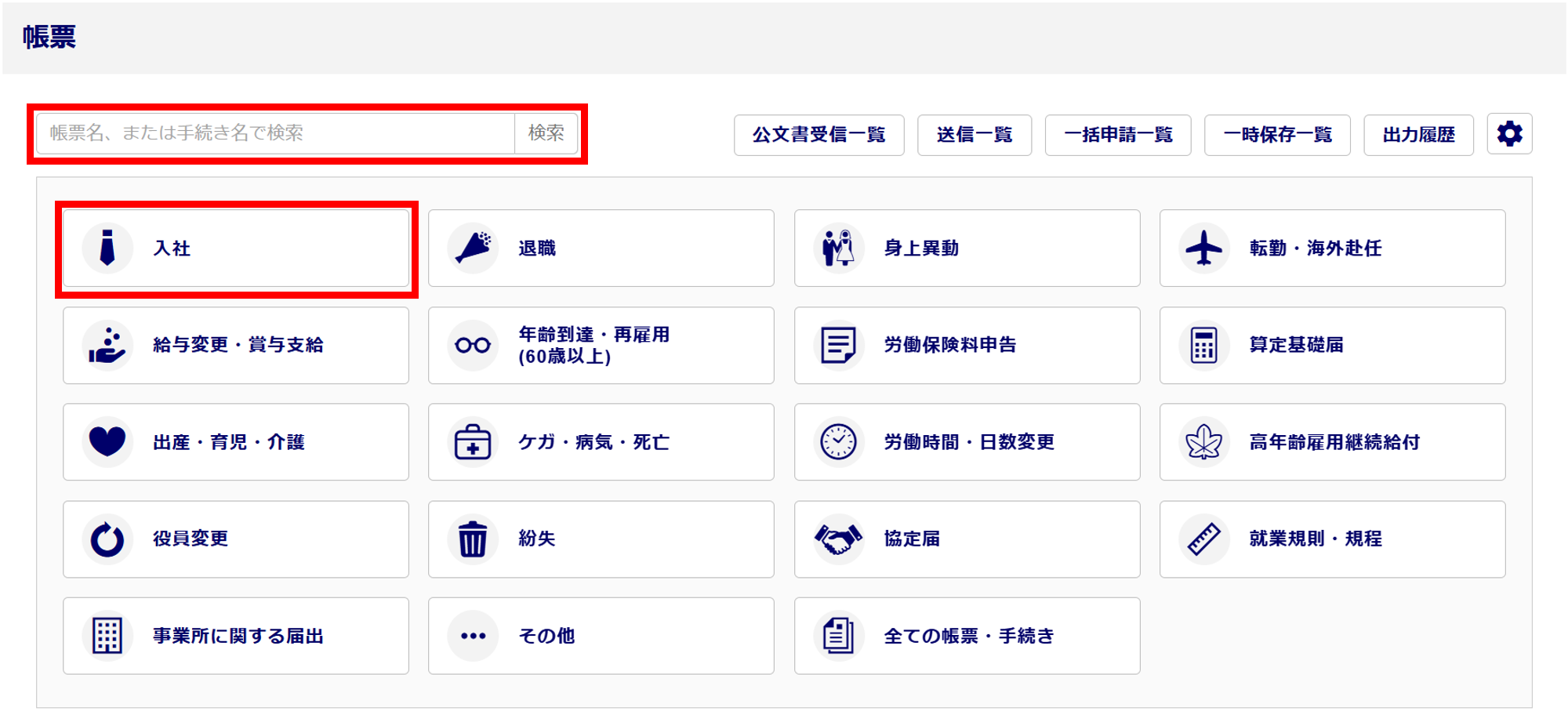 検索窓に帳票名または帳票名の一部を入力し[検索]をクリックします。