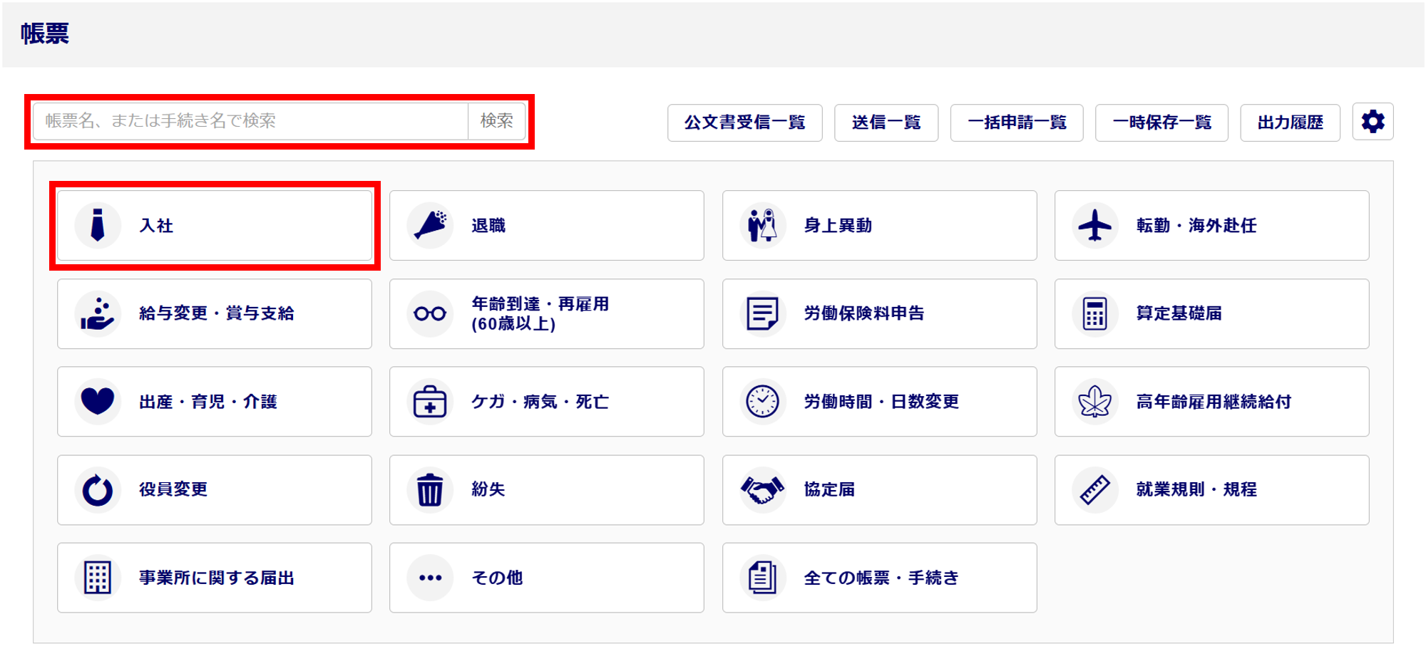 検索窓に帳票名または帳票名の一部を入力し[検索]をクリックします。