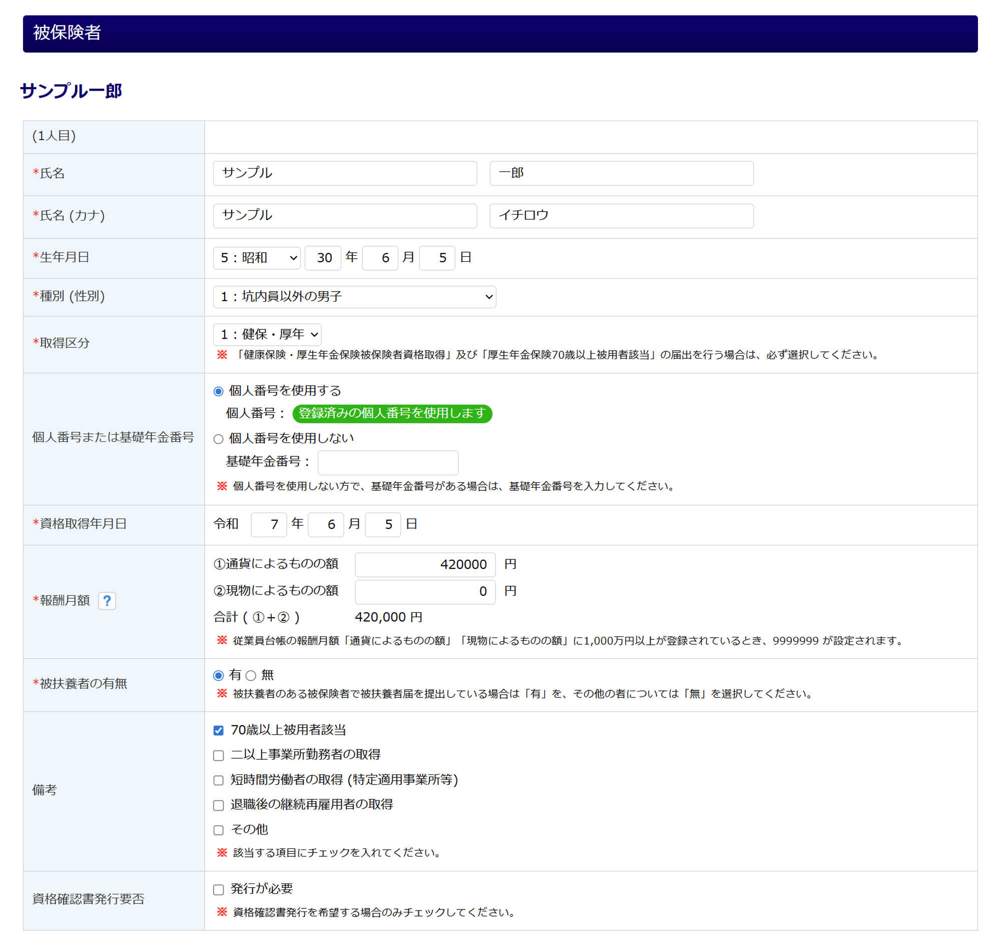 「被保険者」欄へ引用されている被保険者情報を確認、必要に応じて修正します。