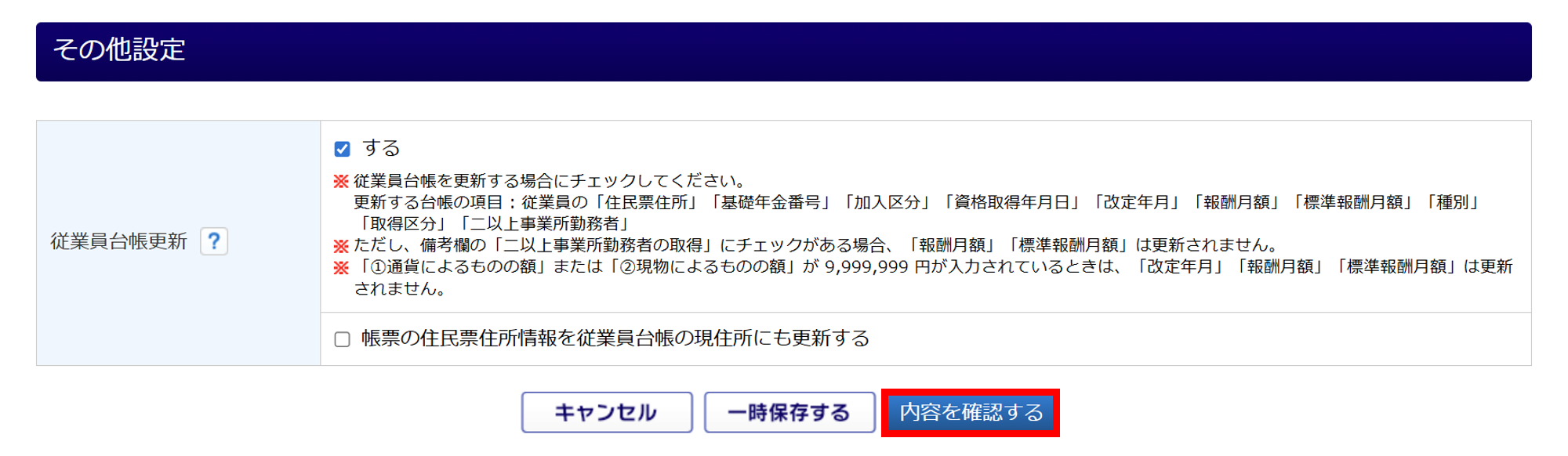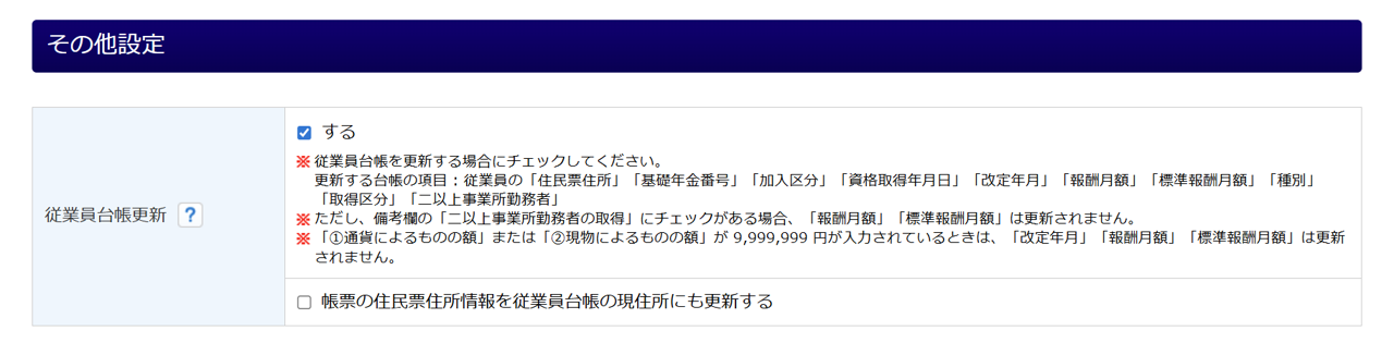「従業員台帳更新」の「する」にチェックすると、本手続き画面で入力した内容を従業員台帳へ更新することができます。