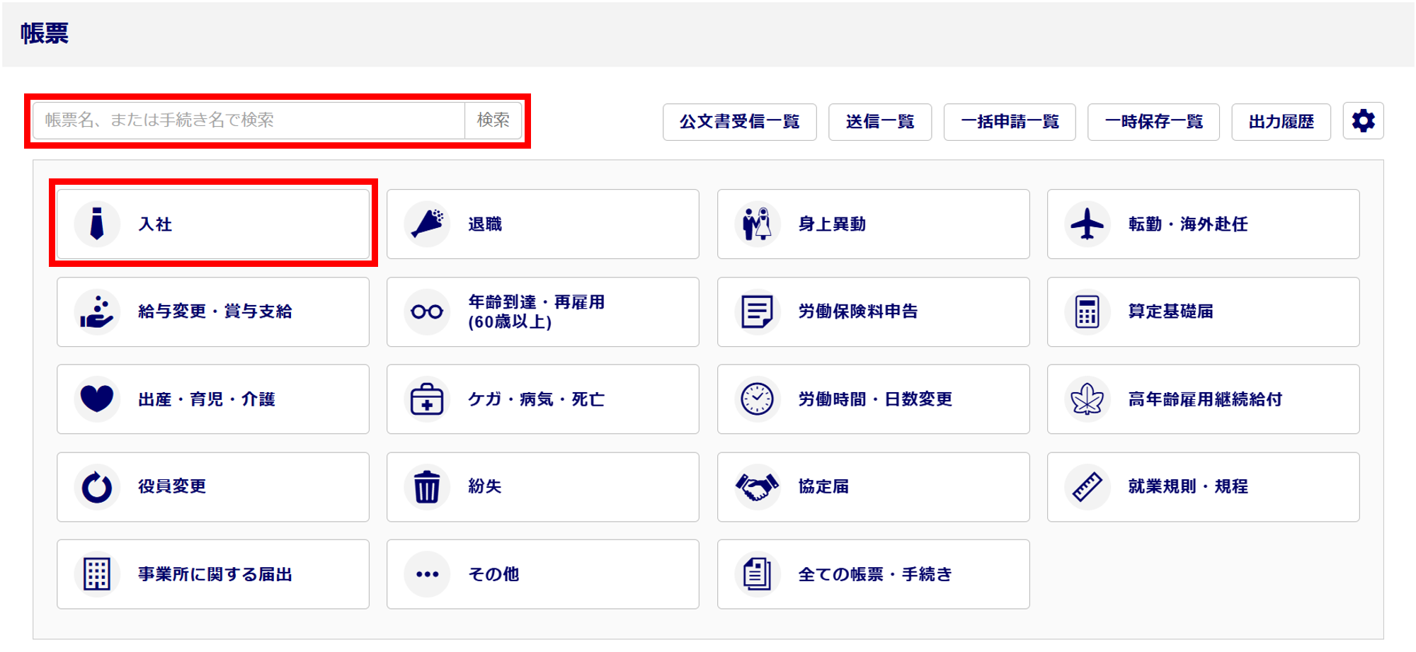 検索窓に帳票名または帳票名の一部を入力し[検索]をクリックします。