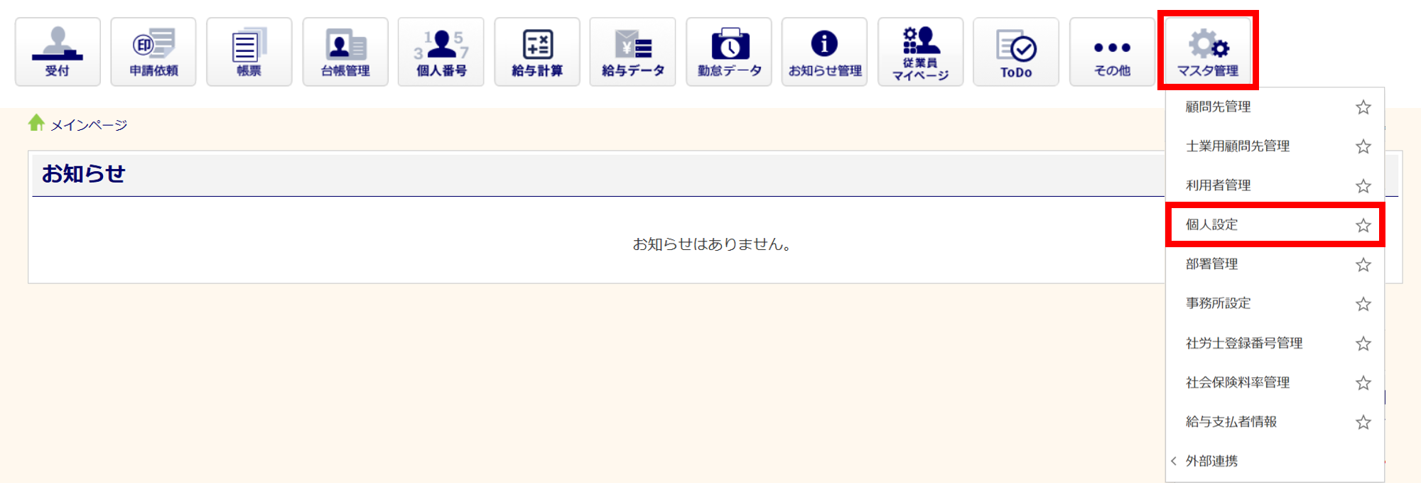| お知らせ通知メール | 「オフィスステーションからのお知らせ」メールを受信するかどうかを設定します。 ※午後14時以降に登録された「当日が公開日のお知らせ」はメール配信されま せん。 |