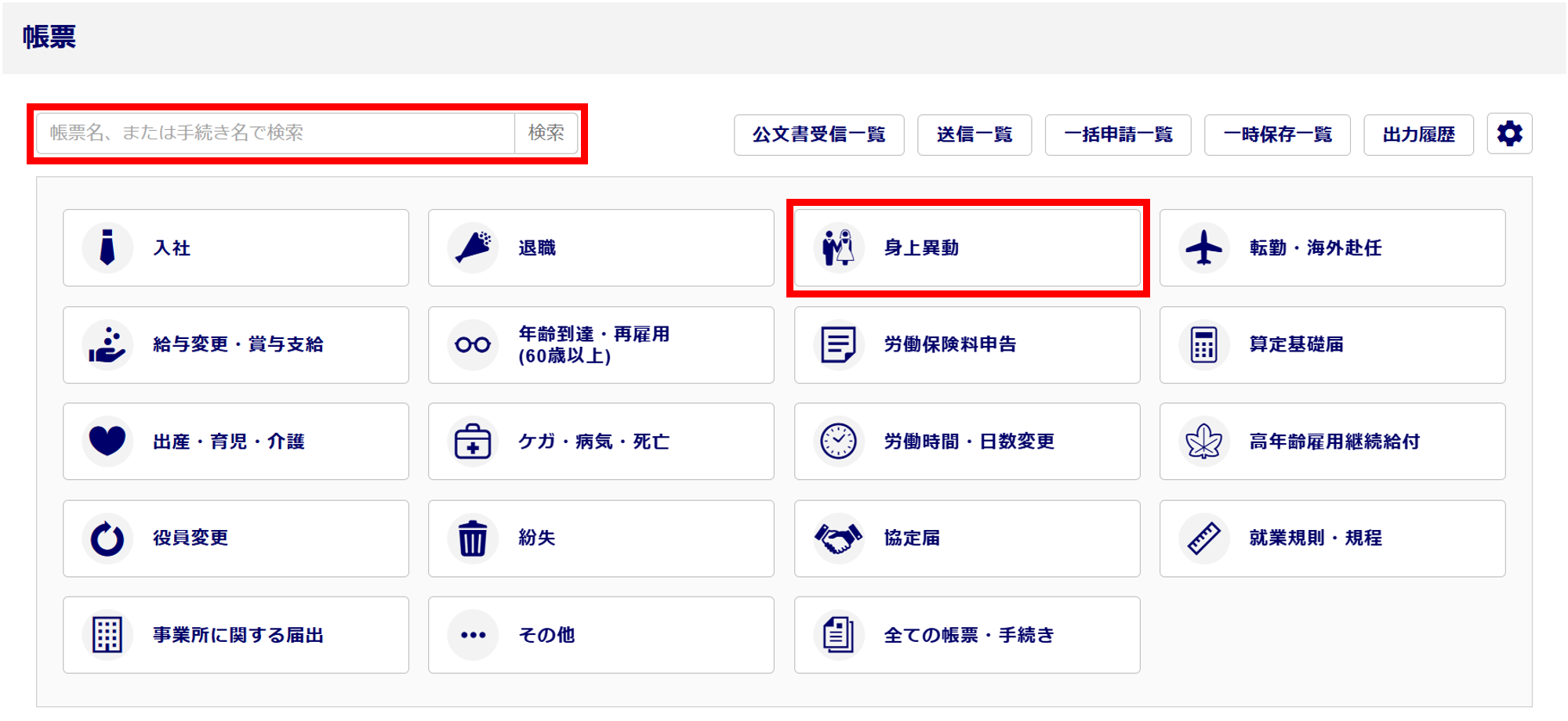 検索窓に帳票名または帳票名の一部を入力し[検索]をクリックします。