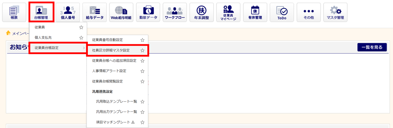 [台帳管理]>[従業員台帳設定]>[社員区分詳細マスタ設定]をクリックします。