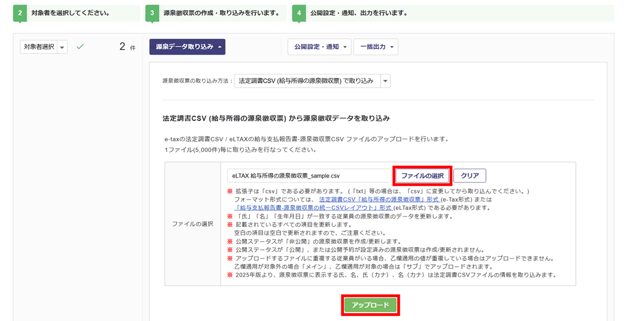 [ファイルの選択]をクリックし、取り込みをおこなう「法定調書CSV(e-Tax形式)」または「給与支払報告書-源泉徴収票CSV(eLTAX形式)」ファイルを選択、[アップロード]をクリックします。