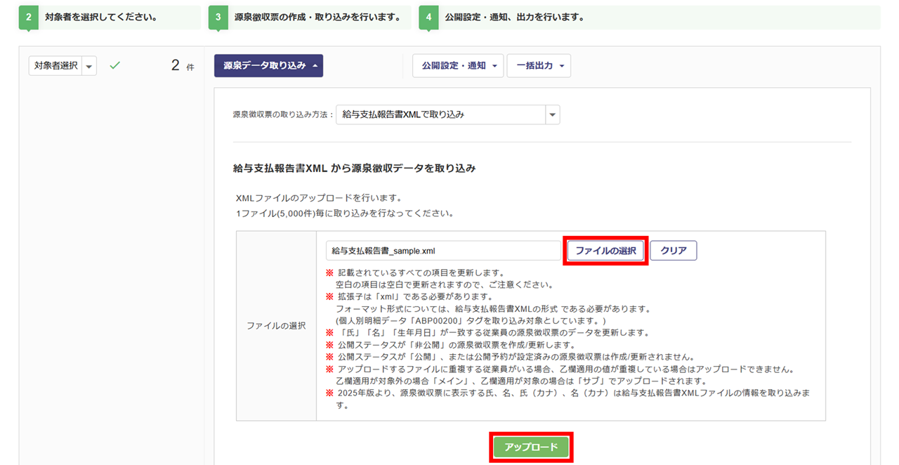 [ファイルの選択]をクリックし、取り込みをおこなう給与支払報告書XMLファイルを選択、[アップロード]をクリックします。