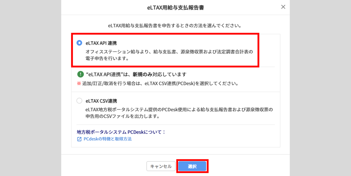 「eLTAX API 連携」を選択し、[選択]をクリックします。