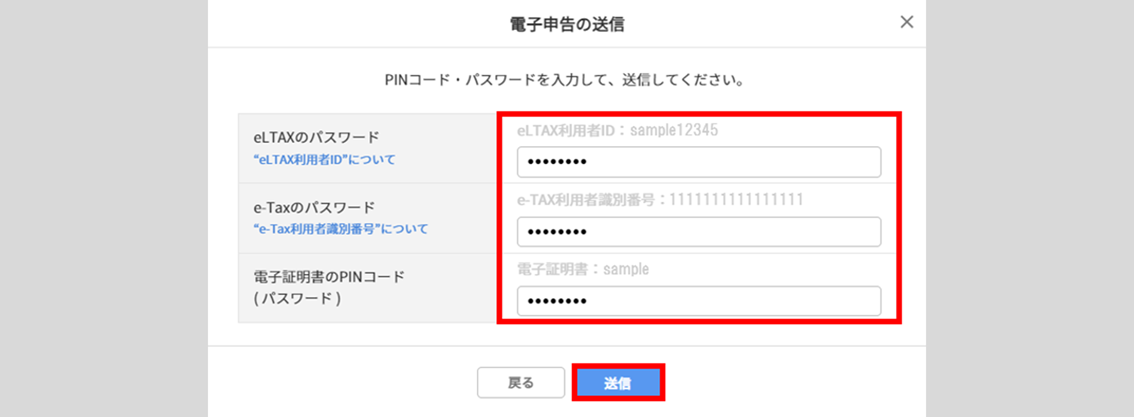 ※メニュー[基本設定]>「電子申告」にて、「電子証明書のPINコード(パスワード)」を登録している場合は、自