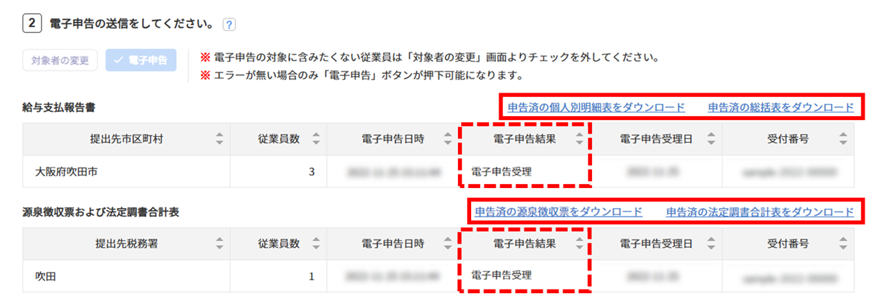 「電子申告結果」列に「電子申告受理」と表示されたら電子申告は完了です。