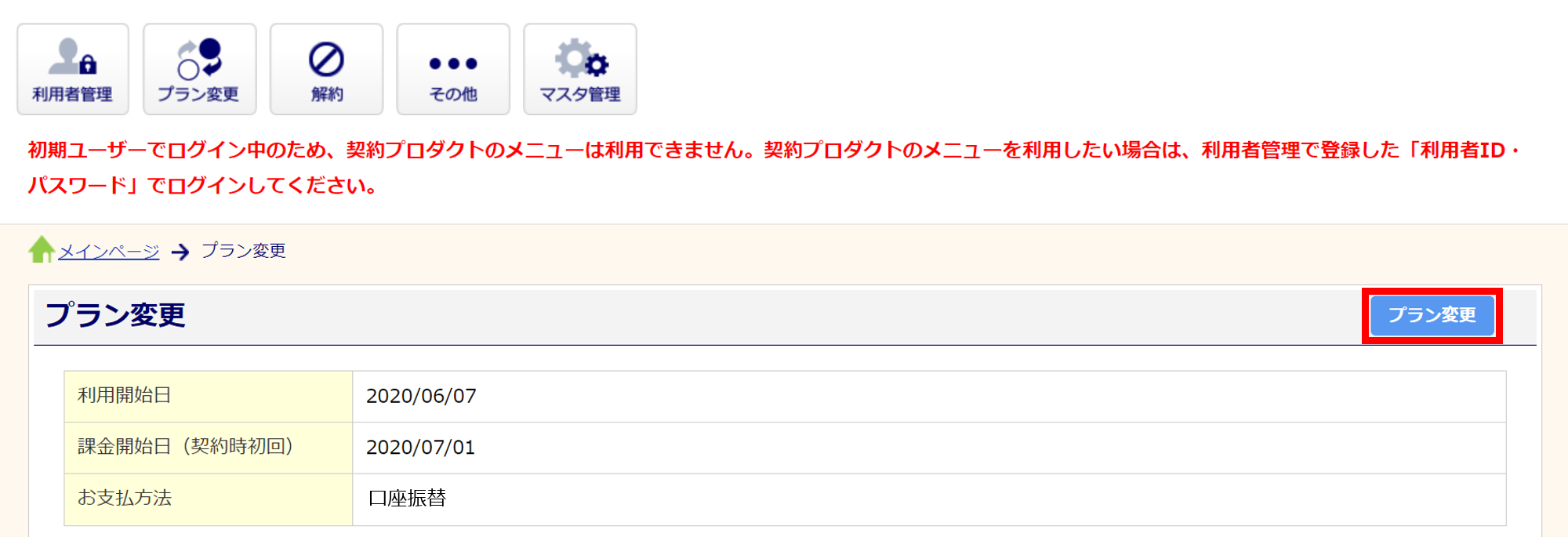 『初期ログインID・PW』でログインできている場合に限り、システム画面に赤文字で「初期ユーザーでログイン中のため、契約プロダクトのメニューは利用できません。契約プロダクトのメニューを利用したい場合は、利用者管理で登録した「利用者ID・パスワード」でログインしてください。」と表示されます。