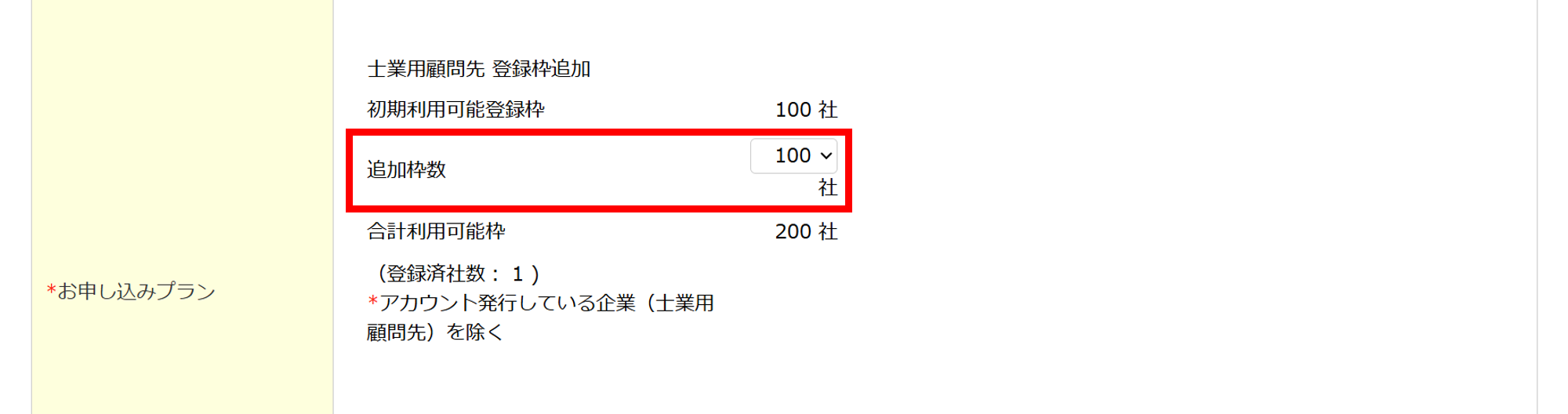 「追加枠数」にて、追加する士業用顧問先の枠数を選択します。