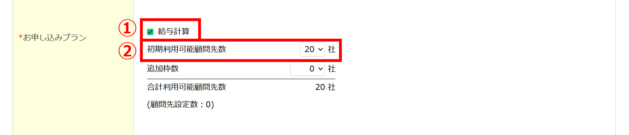 「給与計算」()にチェック、「初期利用可能顧問先数」()を選択します。