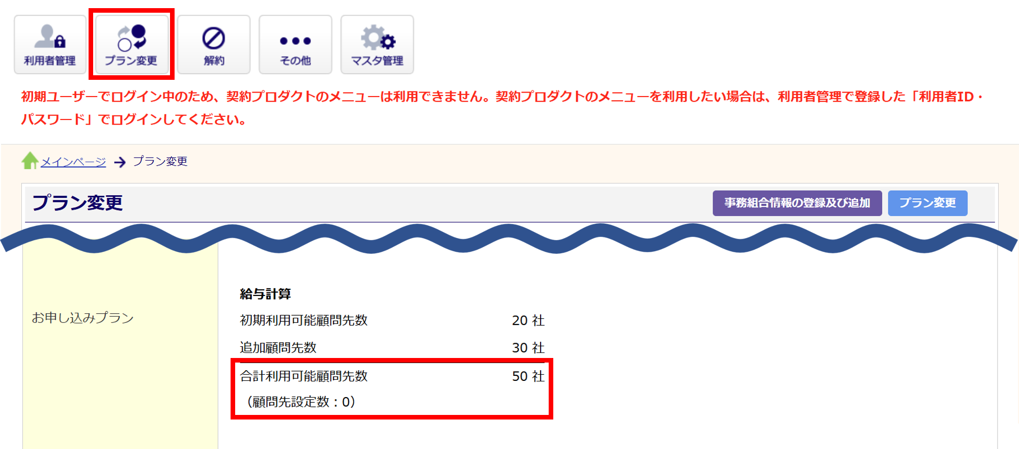 [プラン変更]をクリックし、「給与計算:合計利用可能顧問先数」からご確認ください。