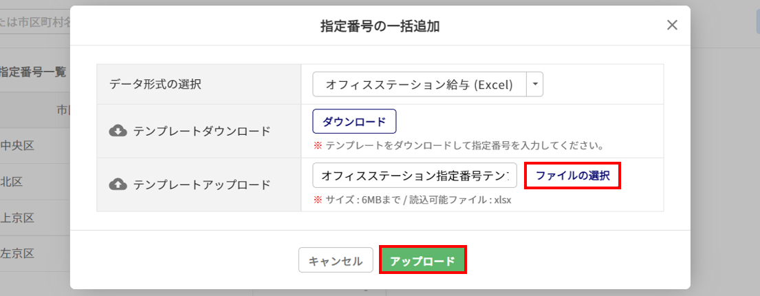 3.[ファイルの選択]から2.のファイルを選択し、[アップロード]をクリックします。