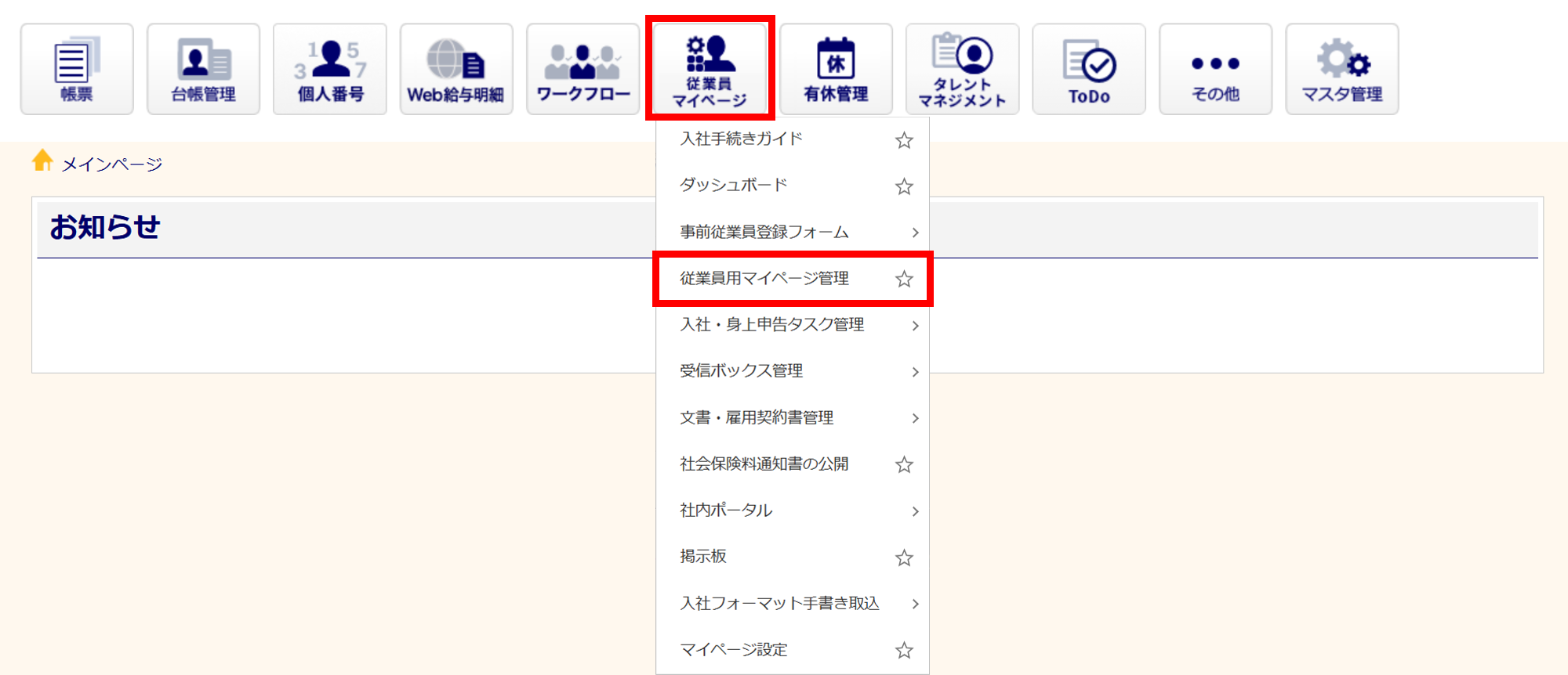 [従業員マイページ]>[従業員用マイページ管理]をクリックします。