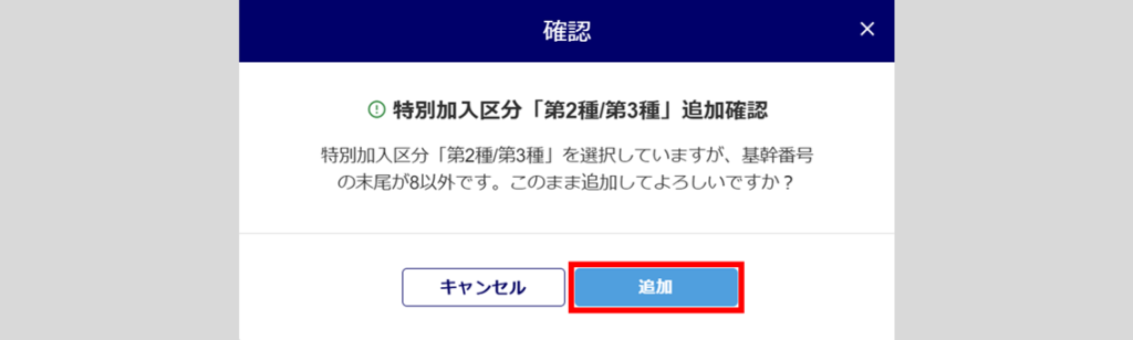 なお、労働保険番号『11桁目:8』(基幹番号の末尾が「8」)以外の場合で、「特別加入区分」項目に「第2種/第3種」を選択した場合は、「確認」ウィンドウが表示されます。内容を確認後、[追加]をクリックします。