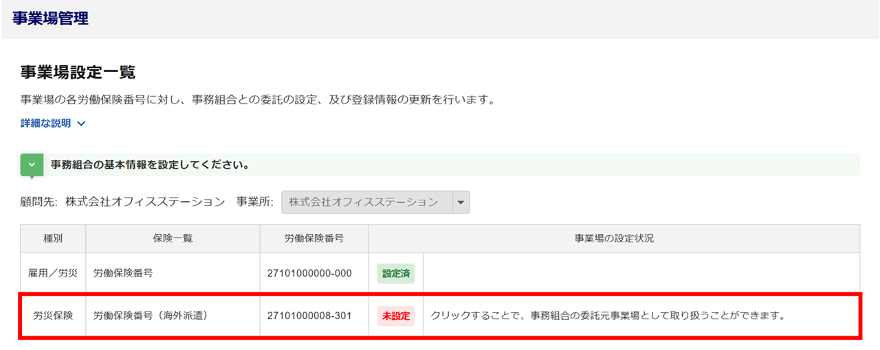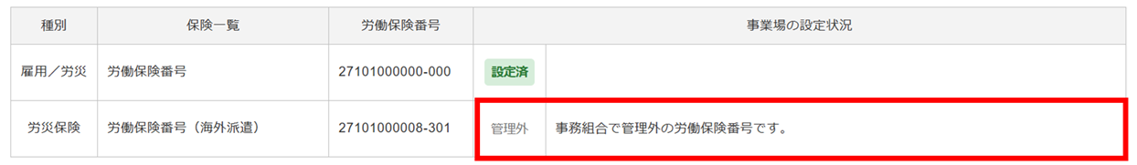 「事業場の設定状況」列に「管理外:事務組合で管理外の労働保険番号です。」と表示されている場合は、「労働保険基幹番号」の登録作業が完了していない状況です。