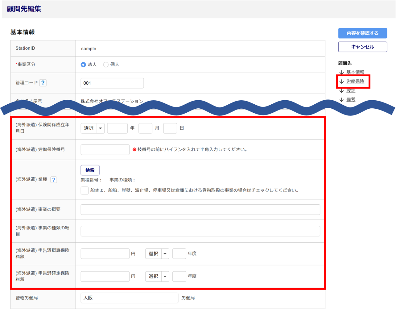 「顧問先管理」の情報に、海外派遣の労働保険番号等の情報を設定します。
