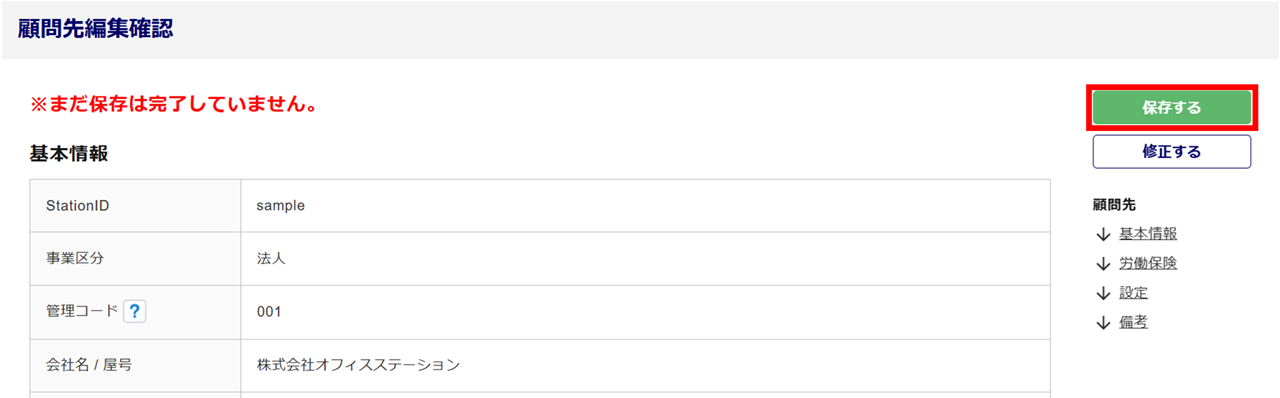 画面左上に「変更しました。」と表示されたら、顧問先情報の編集は完了です。