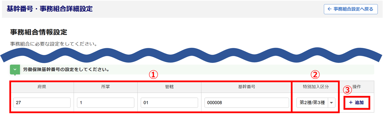 「労働保険基幹番号」(①)を入力、「特別加入区分:第2種/第3種」(②)を選択し、[追加](③)をクリックします。