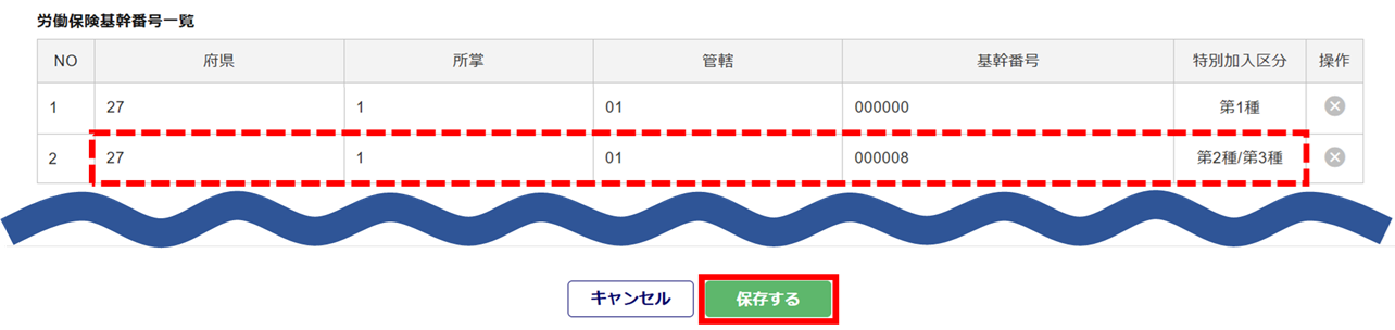 追加した労働保険基幹番号情報が表示されていることを確認後、画面最下部までスクロールし、[保存する]をクリックします。