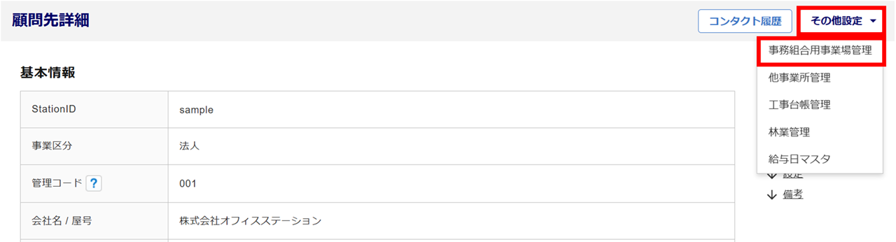 [その他設定]>[事務組合用事業場管理]をクリックします。