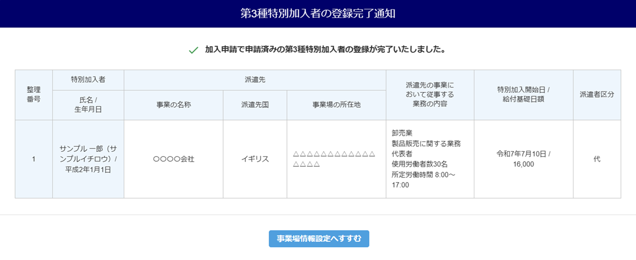 事前に「特別加入申請書(海外派遣者)」の作成をおこなっている場合、「第3種特別加入者の登録完了通知」ウィンドウが表示されます。