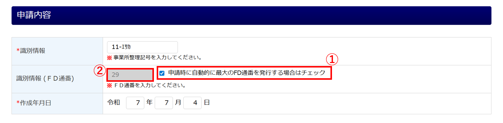 【申請時に自動的に最大のFD通番を発行する場合はチェック】について