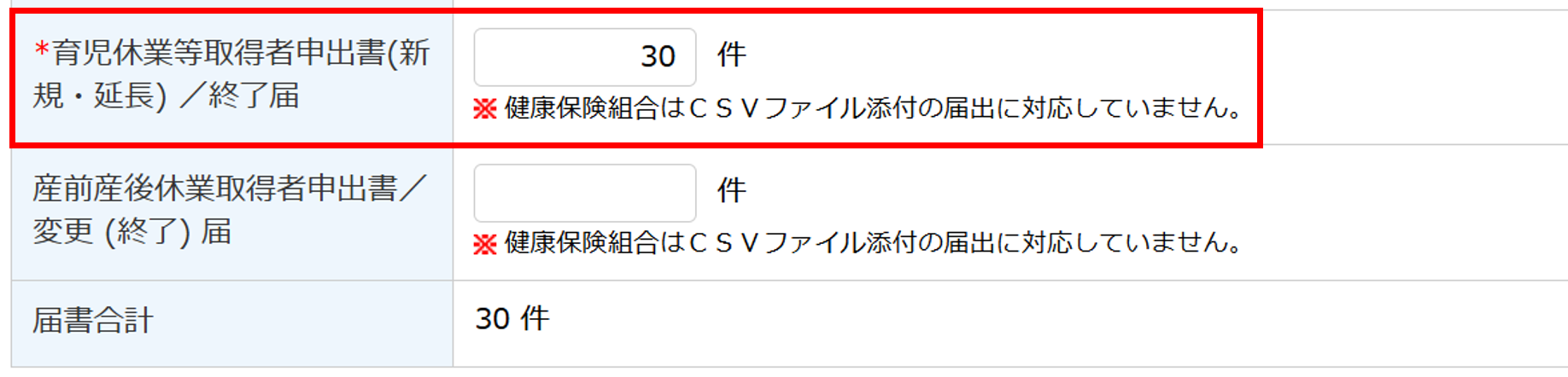 「育児休業等取得者申出書(新規・延長) /終了届」に申請する被保険者数を入力します。