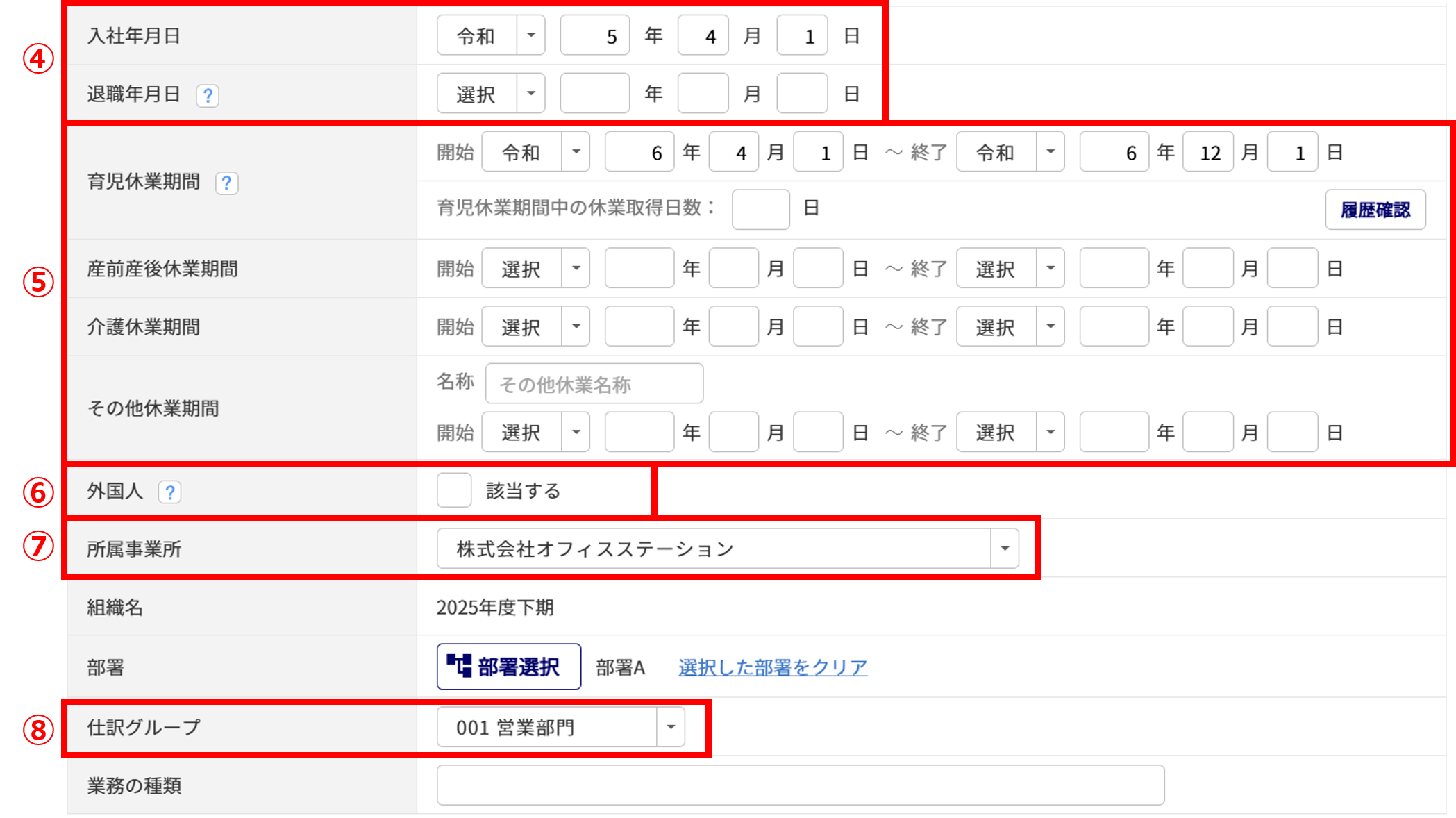 | ⑦ | 所属事業所 | 「他事業所管理」で登録している情報が選択できます。 給与計算の結果を、オフィスステーション本体「給与データ」へ連携時、設定している「所属事業所」ごとにデータが連携されます。 事業所ごとに年度更新をおこなう場合、設定をおすすめしています。 |