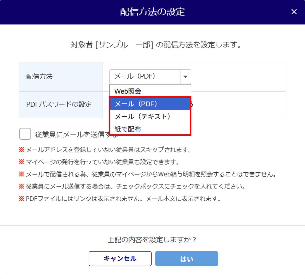 「配信方法の設定」にて、配信方法を「メール(PDF)」または「メール(テキスト)」を設定することで、マイページがなくても、給与明細をメールで配信することができます。