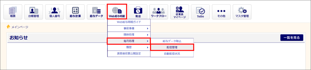 [Web給与明細]>[毎月処理]>[配信管理]をクリックします。